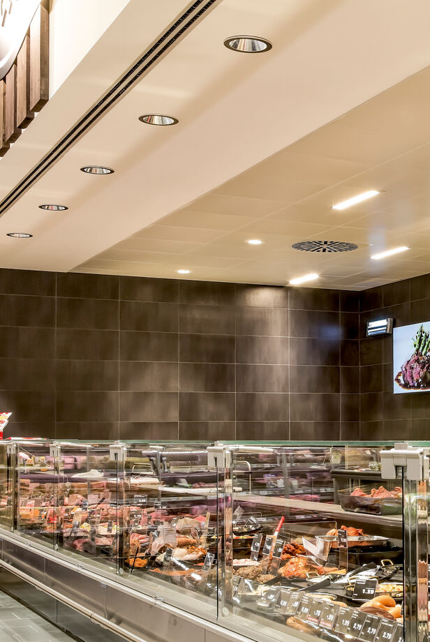 Les Airblock FG occupent à Haselünne une fonction bien particulière. Ces unités plates destinées au chauffage, au refroidissement, à la ventilation et à la filtration y sont utilisées comme protection hygiénique dans les rayons frais. L'air est aspiré derrière les rayonnages et soufflé avec une surpression via les fentes de ventilation devant les rayonnages. Dans l'entrée du magasin, un rideau d'air chaud Tandem et deux aérothermes Ultra dernier cri assurent le chauffage, pour accueillir les clients comme il se doit. Dans les réserves, un aérotherme TOP assure un chauffage parfaitement économique.