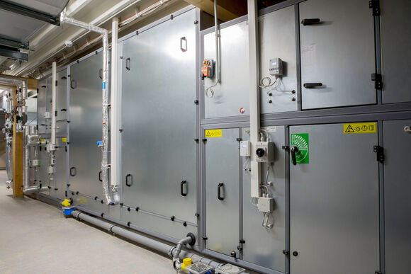 Pour la ventilation et le refroidissement centralisés, des centrales de traitement d'air conçues par la filiale NOVA, et dotées de modules Ka2O Kampmann entrent en jeu. La technologie Ka2O est une technologie avant-gardiste, avec fonctionnement par refroidissement par eau basé sur les énergies renouvelables et indirect. Contrairement aux systèmes classiques de refroidissement par évaporation, dans les modules Ka2O, l'humidification de l'air se fait directement dans les échangeurs thermiques. La géométrie spécifique des lamelles et de la direction de l'air dans l'échangeur thermique permet un refroidissement des températures extérieures jusqu'à 18 k. La conception modulaire évite en outre la perte de pression et permet une adaptation parfaite aux architectures. Elle peut aller de trois modules, assurant le traitement de volumes d'air de 1 200 m³/h, à 60 modules, assurant le traitement de 24 000 m³/h. Le magasin EDEKA de Haselünne utilise pour sa surface commerciale de 1 500 m2 24 modules, pour un volume d'air nominal de 9 600 m³/h. L'hiver, les appareils ont recours à la récupération de chaleur. Combinés à des registres, alimentés à Haselünne par la chaleur générée par les congélateurs, ils suffisent à chauffer les locaux et il n'y a pas besoin de recourir à une chaudière. Chaque appareil installé pour EDEKA respecte en outre les exigences strictes des directives ErP.