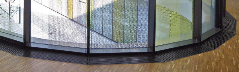 En architecture moderne, on a souvent recours à des façades entièrement vitrées comme élément de style. Le verre est un matériau souvent utilisé, en particulier sur les immeubles, les bâtiments représentatifs et les jardins d’hiver, car il est synonyme d’ouverture et de transparence. Pour ne pas bloquer la vue en installant des chauffages ou des allèges de fenêtre classiques, on place la plupart du temps des chauffages en caniveau derrière la façade vitrée. Lorsqu’il fonctionne de façon traditionnelle, l’air chauffé par le convecteur, que ce soit par convection naturelle ou assistée par ventilateur, s’élève le long de la façade vitrée et pousse l’air ambiant plus froid vers le bas. Un circuit est ainsi créé et toute la pièce est chauffée.