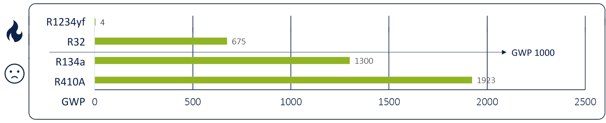 Les interdictions d’utilisation de certains gaz fluorés entraînent une augmentation des fluides frigorigènes à faible potentiel de réchauffement global (PRG). Il s’agit principalement de fluides frigorigènes « naturels » comme le CO2 ou le propane. Le propane se distingue par une valeur PRG extrêmement faible de seulement 3/kg.